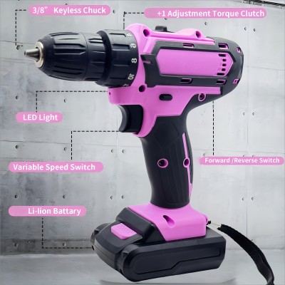 [24/65pcs Power Tool Set] 24pcs OR 65pcs Industrial Power Tool Set | Pink Brushless Drill OR CrV Tool Kit | 21V Dual Li-ion (2×1200mAh)